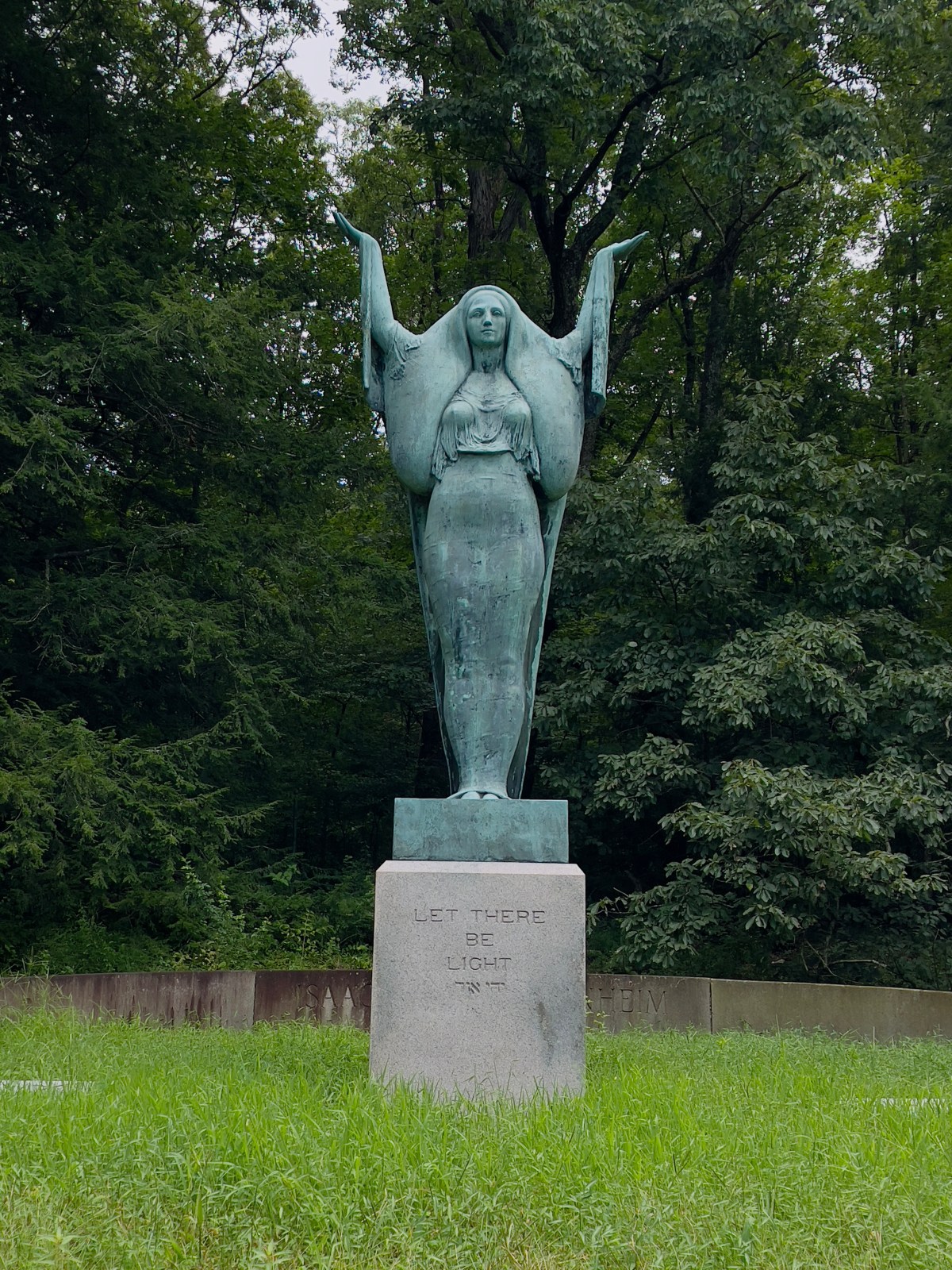 Photo displays a statue of a woman with the words "Let there be light" written in English and Hebrew.